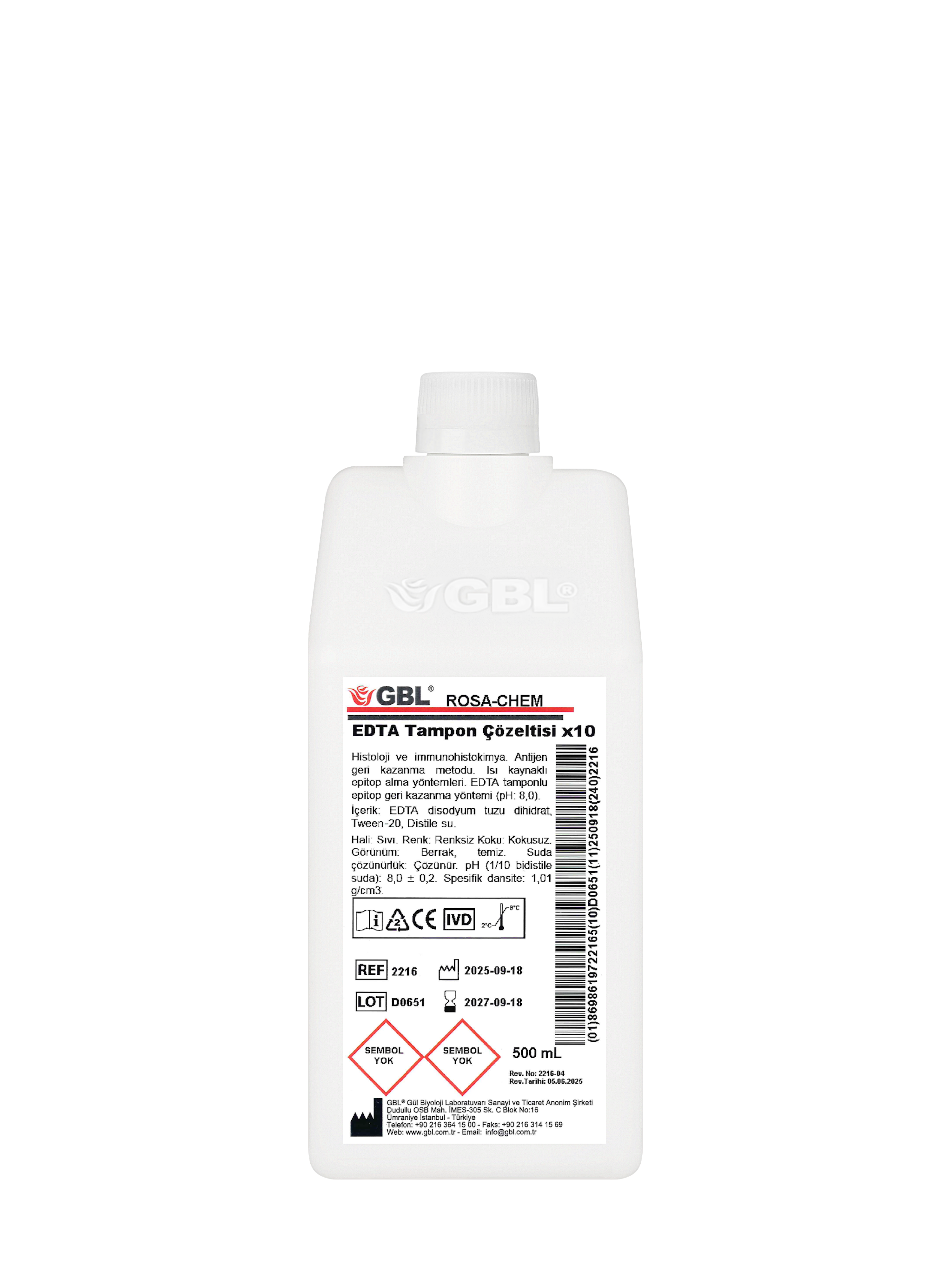 EDTA buffer solution (x10) is a widely used chemical solution in laboratories, often preferred for its chelation (ion binding) properties. EDTA (ethylenediaminetetraacetic acid) plays an important role in biochemical experiments and analysis by binding metal ions. It is used for the recovery of antigens in tissue sections and during staining processes. It improves staining results by eliminating the effect of metal ions. It is used to inhibit the adhesion of cells and to suspend cells. This allows temporary separation of cells in cell culture experiments. Inhibits enzymatic activities caused by metal ions in protein samples. This is especially important during purification of proteins and enzymes. EDTA is used to prevent the degradation of nucleotides. It inhibits nuclease activity by binding metal ions and thus ensures the protection of DNA and RNA.